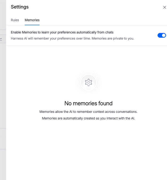 - Toggle on or off: Use the toggle at the top of the Memories tab to enable or disable the feature. When enabled, the description reads: "Enable Memories to learn your preferences automatically from chats. Harness AI will remember your preferences over time. Memories are private to you."