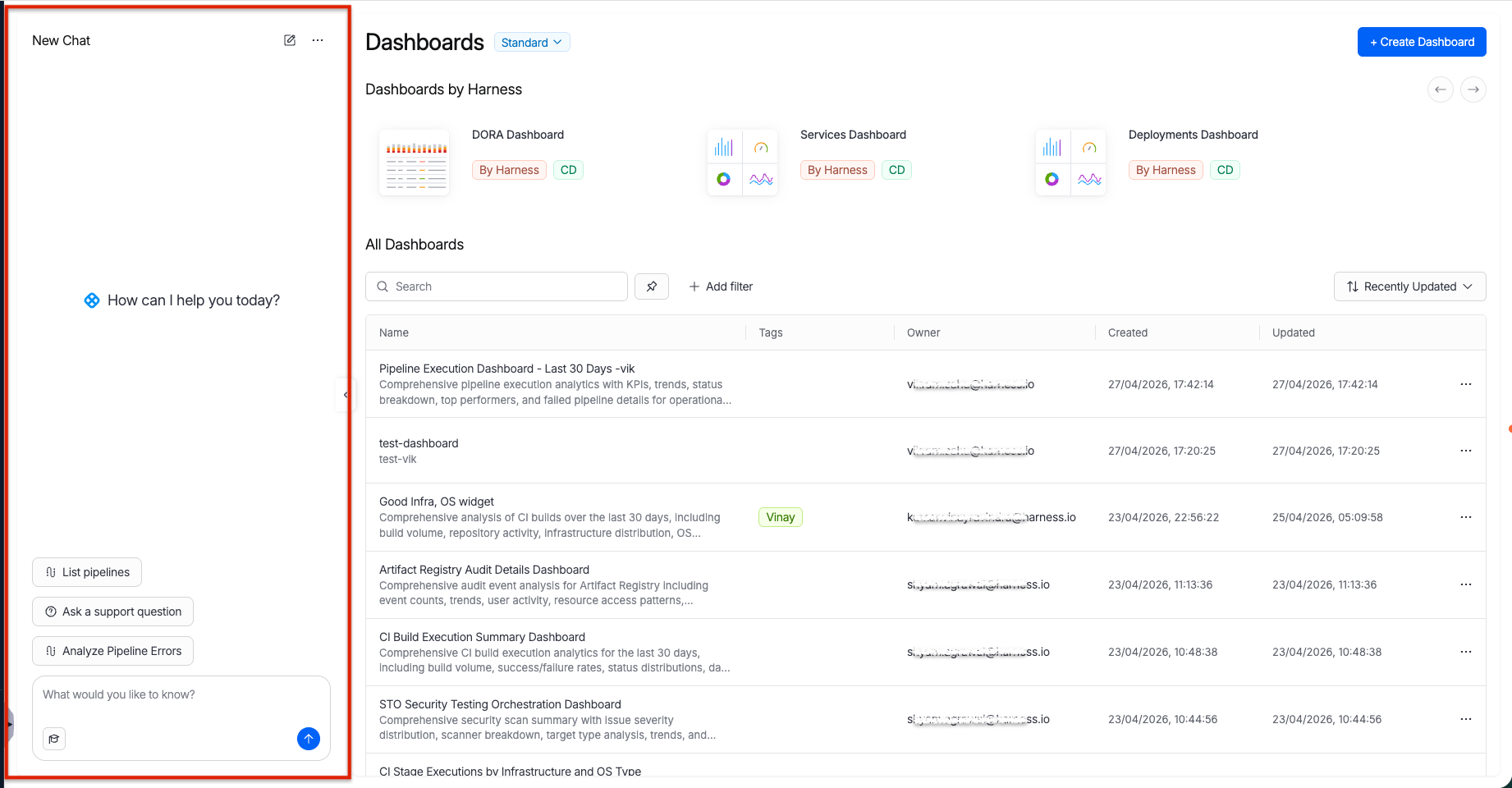 Harness Dashboards let you build custom views to track deployments, costs, builds, and other platform data in one place. You can create dashboards manually or use the AI chat assistant to generate them from a plain-language description.