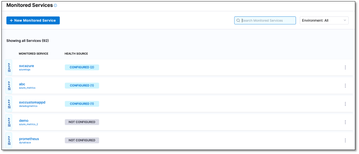 - In Harness, select Deployment > Monitored Services. A list of monitored services is displayed. The list also displays the number of health sources configured for each monitored service.